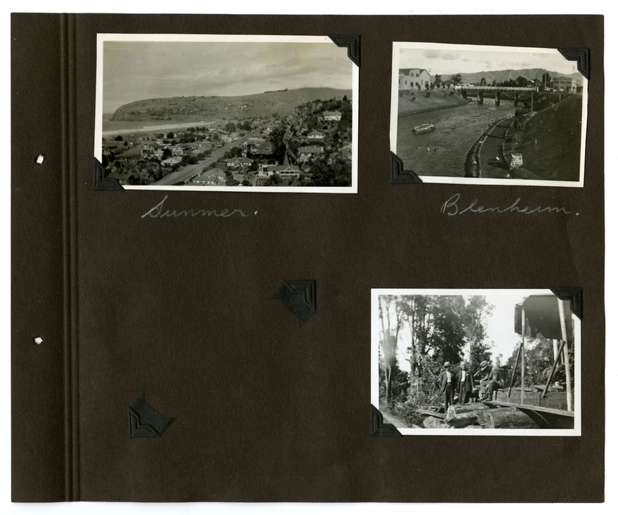 This 1930s photograph album belongs to the Barrow Family, of Palmerston North. Subjects include family members, pets, airplanes, the 1935 flood, cars and car crashes, the Esplanade Gardens and other local landmarks.