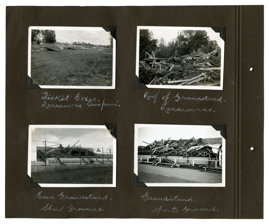 This 1930s photograph album belongs to the Barrow Family, of Palmerston North. Subjects include family members, pets, airplanes, the 1935 flood, cars and car crashes, the Esplanade Gardens and other local landmarks.