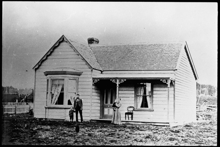 The Vautier Homestead in its original form, photographed in about 1881-82. Shown are its original Danish-born openers, Las and Christine Andersen Lassen (nee Bak), and their children: Peter (b 1879) and Ellen (b 1881). Las Lassen came to New Zealand aboard the England. The Lassen established the property and built this well-known house and barn (obscure), before moving to Bunnythorpe in about 1889. Note the school site on the left and the bush on the terrace behind the house. The loft above the barn served as the Lassen's home for several years before they built the house. See ‘A Time of Transition’ by Val Burr, page 3.