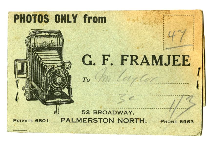 A negative sleeve from G.F. Framje photography studios. Born in Ilford, England, George Feroza Framje moved to Palmerston North in the early 1920s and operated a photography business until the mid-1950s. Mr. Framje was a member of the Palmerston North Rotary Club and took a particular interest in the club's international service committee. As a Freemason, Framje was a Past Master of the Lodge Otangaki, No. 70, in Ashhurst.