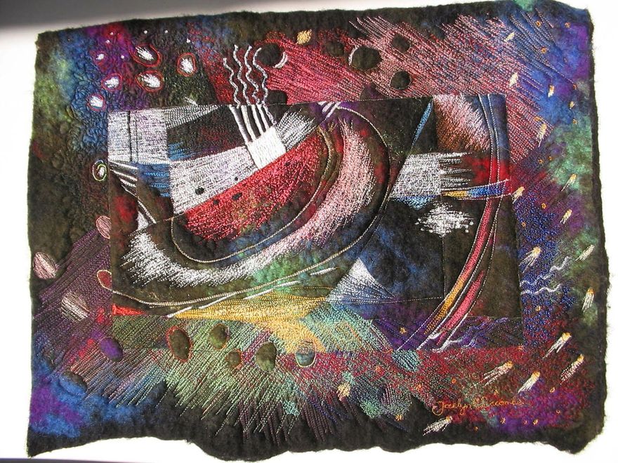 Cotton, silk and polyester threads machine embroidered onto hand-felted wool.