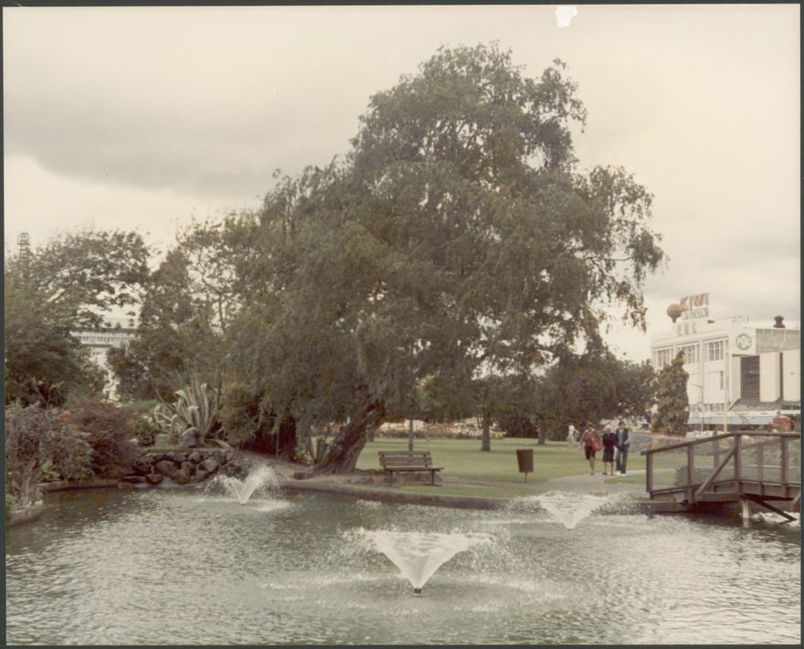 This photograph shows a view of The Lakelet in The Square. The PDC can be seen on the right, topped with the Kiwi Bacon sign and giant kiwi. This image is from a series of framed photographs that were rescued from a local dumpster.