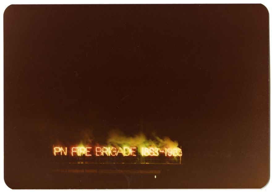 Image 1: Trucks and officers from the Palmerston North Fire Brigade line up outside the station for the centennial celebrations. Image 2: A firework display lights up with the words, "PN FIRE BRIGADE 1883-1893". These photographs were probably shot by local photographer Maurice Costello - once chief photographer for the Manawatu Evening Standard.