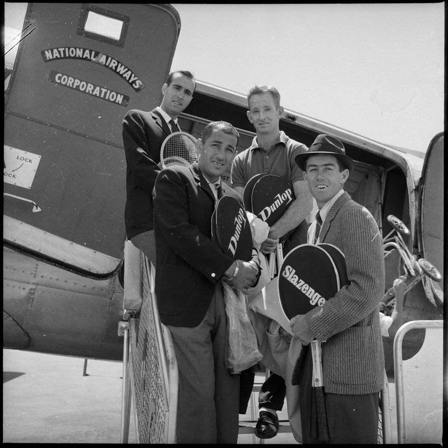 This image was not published in The Manawatu Evening Standard, taken on 1st February 1963 [Four male tennis players, holding their rackets, ready to board a plane]