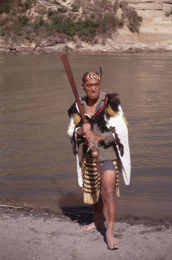 Mac Whakamoe performing the wero at the welcoming ceremony of the re-enactment of the 1871 river landing of Mrs George Snelson and her 16 year-old daughter Matilda Montgomery. The women travelled to Te Papaiōea (Palmerston North) by Maori canoe on the Manawatu River. The re-enactment took place at the river end of Albert Street on the morning of 13 March 1971. To access image please contact us.