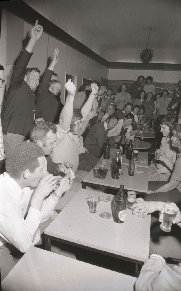 Members of the New Zealand Power Boats Association met in Palmerston North during the weekend of 17-18 May, 1975, for their annual conference and pie eating competition. The competition was held at a Palmerston North tavern, beginning at 2 pm. It took Manawatu boaties, Des Strong and Paul Godbas just 2 minutes 14 seconds to consume 8 pies specially baked for the occasion at a Palmerston North bakehouse. It was the second consecutive win for Manawatu, who took 4 mins 3 seconds to win in 1974. Taranaki boaties were second by a wide margin. Printed in the Manawatu Evening Standard 119 May 1975.
