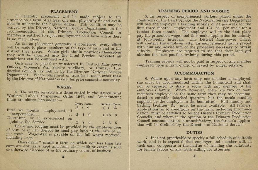 Issued by the Authority of the Director of National Services, this handbook gave information to those serving in the Women's Land Service. It included topics such are wages, accommodation, age limits, hours of work and holidays.