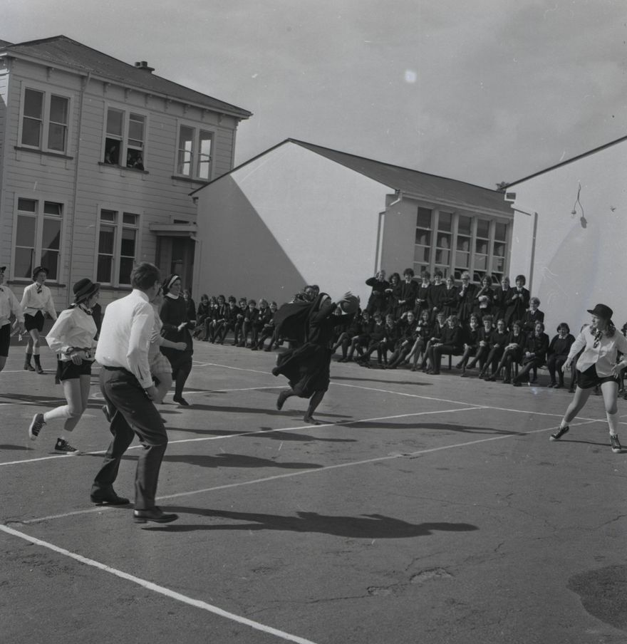 This image was taken for a story that ran in the Manawatu Evening Standard on 20 August 1970 with the caption, "In a grueling netball match which included an assortment of rucks, scrums and lineouts with a smattering of fancy dress, prefects of St Joseph's School in Fitchett Street, were beaten by a superior staff side 36-18. Informed sources have it that the staff side had several ring-ins including a bank manager. Our picture shoes a tense moment as Annette Heiden and Sister Anthony chase after the ball." St Joseph's School was a Catholic High School for girls. When the lease of its grounds and buildings ran out in the late 1970s, it was merged with St Peters College. The Metlife retirement village now stands in Fitchett Street on the old school site.