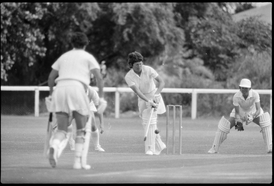 This image was taken (but not used) by the Evening Standard on 21st of January 1982. It depicts the New Zealand women’s cricket team taking on the International XI women’s team in a limited over match for the Hansell's Vita Fresh Women's World Cup 1981/1982. The match was held at Fitzherbert Park in Palmerston North. The New Zealand team won by 97 runs.