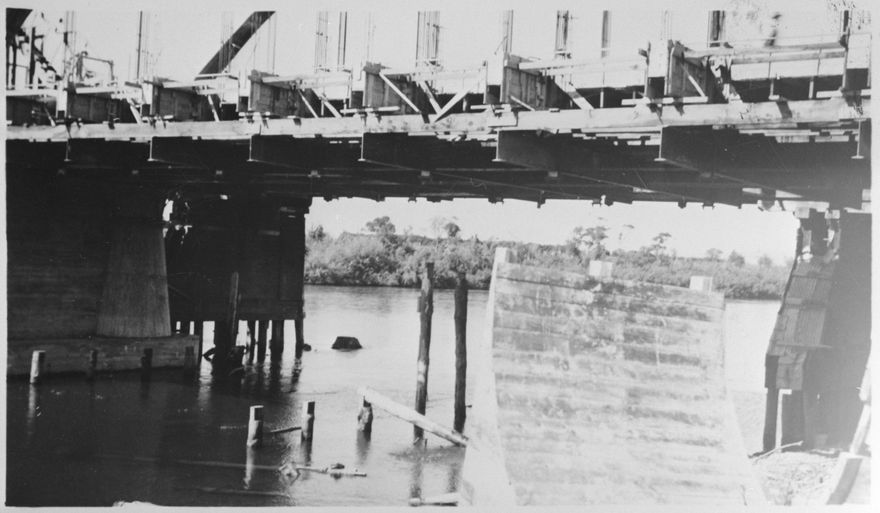 This photograph shows the construction of the decking on the second Fitzherbert Bridge. A new bridge was built in 1987 due to mounting traffic constraints.