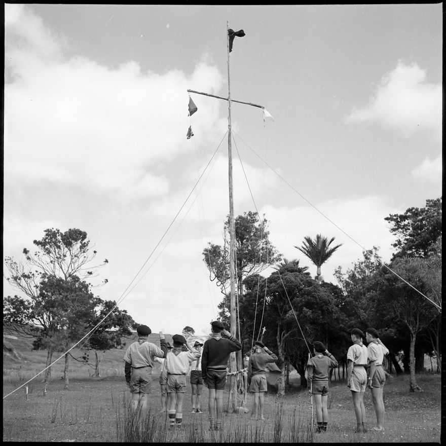 This image was taken for a story that ran in The Manawatu Evening Standard on 30 January, 1964. "A solemn moment... The troop breaks activities and assembles for the flag break. The flag pole, supported by ropes, was fashioned from a tree trunk found new the camp." See also: 2017N_2017-20_018375, 2017N_2017-20_018367, 2017N_2017-20_018371, 2017N_2017-20_018365, 2017N_2017-20_018366, 2017N_2017-20_018368, 2017N_2017-20_018369, 2017N_2017-20_018370, 2017N_2017-20_018372, 2017N_2017-20_018374, 2017N_2017-20_018376