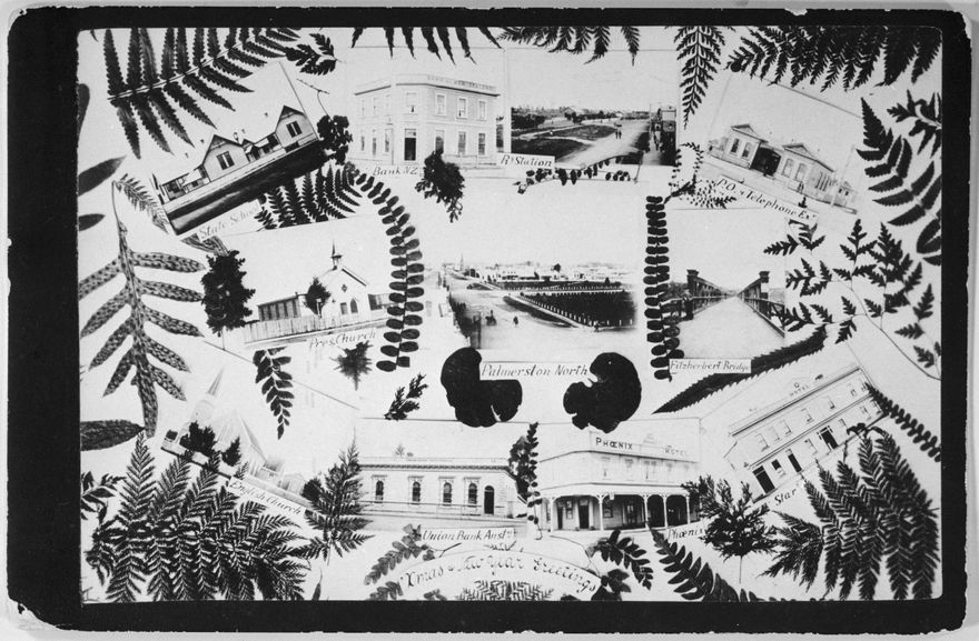 This montage of photographs shows the landmarks of Palmerston North from the late 19th century. Upper row (from left) - State School, Bank of New Zealand, Railway Station, Post Office and Telephone Exchange. Middle row - Presbyterian Church (replaced by a larger building in 1893), Broad Street (with the Roman Catholic spire in a prominent position) and the Fitzherbert Bridge. Lower row - All Saints Anglican Church, the Union Bank of Australia, the Phoenix Hotel and the Star Hotel.