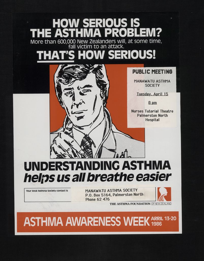"How serious is the asthma problem? More than 600,000 New Zealanders will, at some time, fall victim to an attack. That’s how serious! Public meeting. Manawatu Asthma Society. Tuesday April 15. 8 pm. Nurses Tutorial Theatre, Palmerston North Hospital. Understanding asthma helps us all breathe easier. Your local Asthma Society contact is Manawatu Asthma Society, P.O. Box 5164, Palmerston North. Phone 62476. The Ashthma Foundation of New Zealand. Asthma Awareness Week April 13-20, 1986". Part of a collection of posters that were displayed in the Public Library in the 1970s - 1980s.