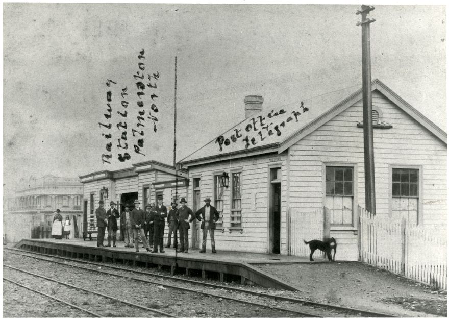Walkley's Commercial Hotel can be seen on the left of the photograph. It stood on the corner of Fitzherbert Avenue and The Square. The people are waiting on the train platform at the Railway Station. The Post Office and Telegraph stands next to the station. See 2014P_Rsq5_007688 for a shot of these buildings from behind.