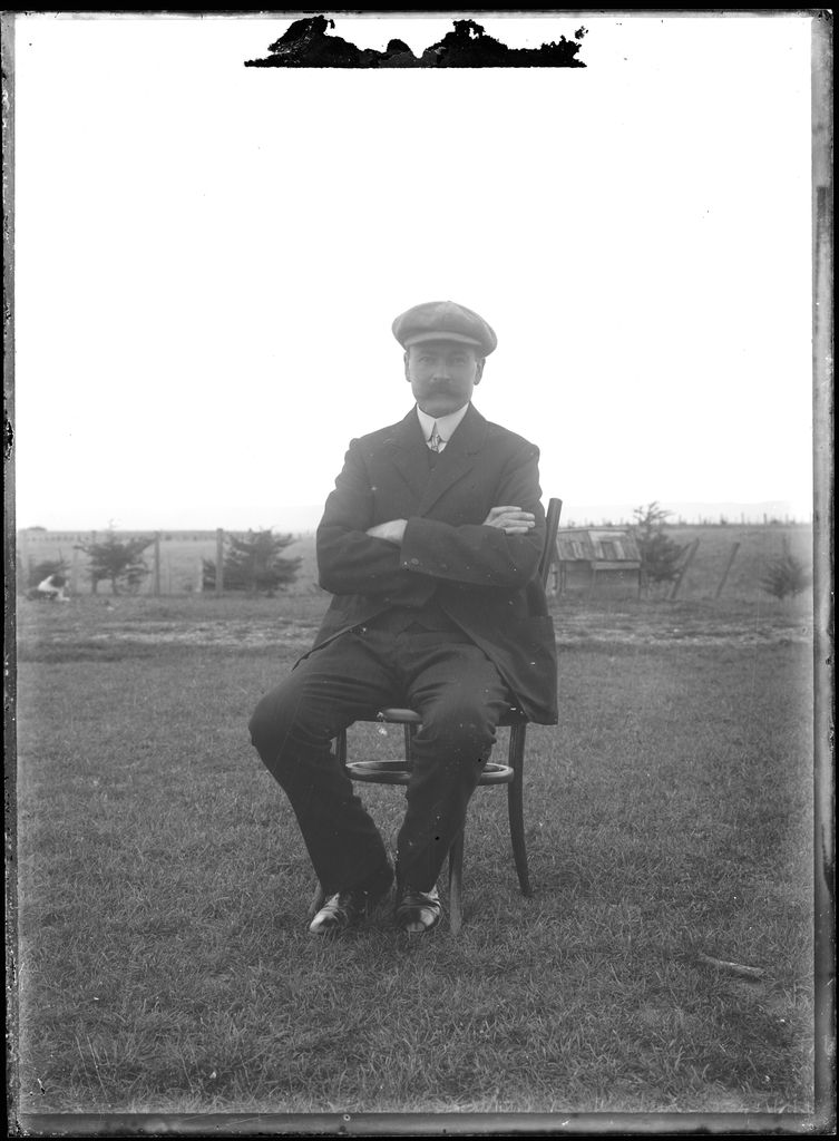 This photograph was created by William James Young in the early 20th century. A large variety of subjects are depicted in the collection, but family, rural life and travel are the most prominent themes. The exact location of the photographs in the Young Collection is unknown, but W J Young lived on a farm in Mt Stewart, Rangitikei, and some of the photographs include his house. The Young family were apparently avid travellers and photographs later in the collection feature scenes from Rotorua, Auckland, Whanganui, as well as other unidentified locations. The portraits are all unidentified, but are presumably of members of the Young family. The photographers parents were George Henry (b 1833) and Jane McDowell (b 1842, d 1916). They came to New Zealand in 1877. The same year, they bought the home farm on Mt Stewart and called it Kilrudden after Kilrudden House, the home of the McDowell family in Ireland. The couple had four children: Ann (b 1873), Margaret (b 1876), John (b 1878) and William James (b 1880). William James married Mary Elizabeth Thompson and they had four children: Doris (b 1914, d 1989), George (b 1916, d 1991), Royden McDowell (b 1925, d 1992) and Noel William (b 1927, d 2013).