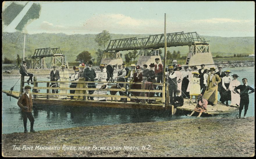 This punt was in operation from 1895 until 1909. It was the second punt to operate on the Manawatu River at Ashhurst, the first being in use from 1871 until the construction of the first bridge in 1886. The bridge (in the background) was damaged in the great Easter flood of 1895 and a new bridge was not constructed until 1909. See also 2007N_Ash7_ASH_0755 for a black and white version.