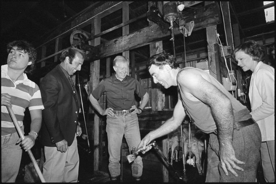 This image was taken by the Evening Standard on the 11th of February 1984 but was not published. It depicts former United States president Jimmy Carter and his wife Rosalynn visiting the hobby-farm of Richard and Barbara Walton at Aokautere. Also featured is chief Wool Board shearing instructor Robin Kidd.
