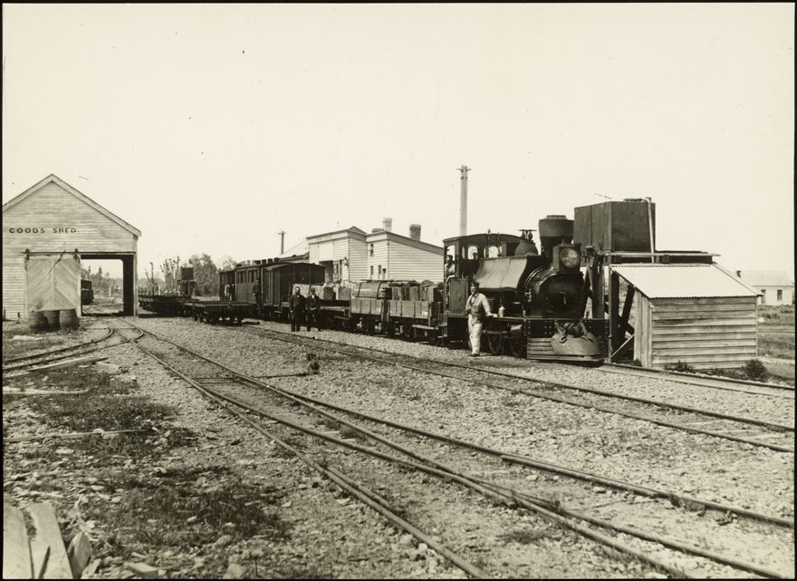 Feilding Railway Station was situated on the Palmerston North to Wanganui Line. There was a large goods shed and water-tanks at the station and the local post and telegraph office was on the railway platform. Six trains passed Feilding daily during this period. The locomotive shown is an F class, designed and built in England for the Public Works Department from 1873 - 1921. They were the second biggest locmotive class in New Zealand, but only five served in the North Island, with all five being assigned to Wanganui in 1878.