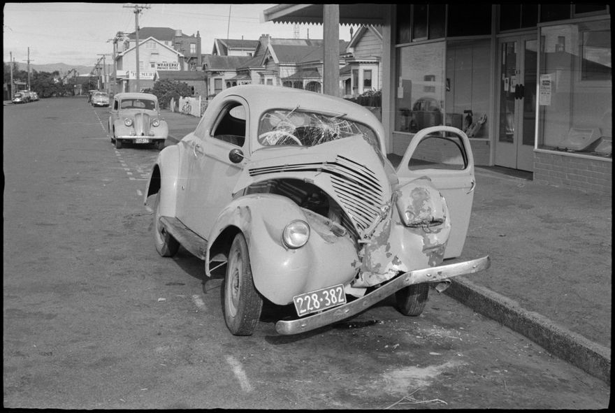 Caption: “Two youth were injured when this car hit the Fitzherbert Bridge at midnight.”
