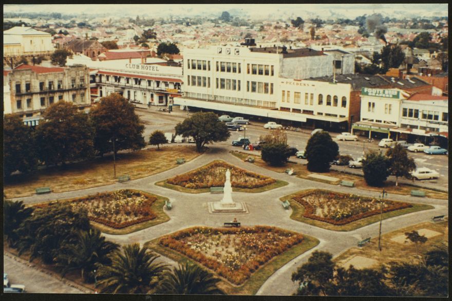 This colour photograph is of the corner of Church Street East and The Square. The large three-storey building in the centre of the photograph is the PDC building. This building was constructed 1929-1930. In 1956 the PDC was taken over by the Manawatu Co-Operative Society and renamed the Premier Department Store - the branding must have changed soon after this photograph was taken. In 1988 the company went into receivership and this building was demolished in 1990. It is now the site of the Plaza shopping mall. The white marble statue in the centre of the photograph is the Statue of Te Awe Awe, which still stands in the same location today [2016].