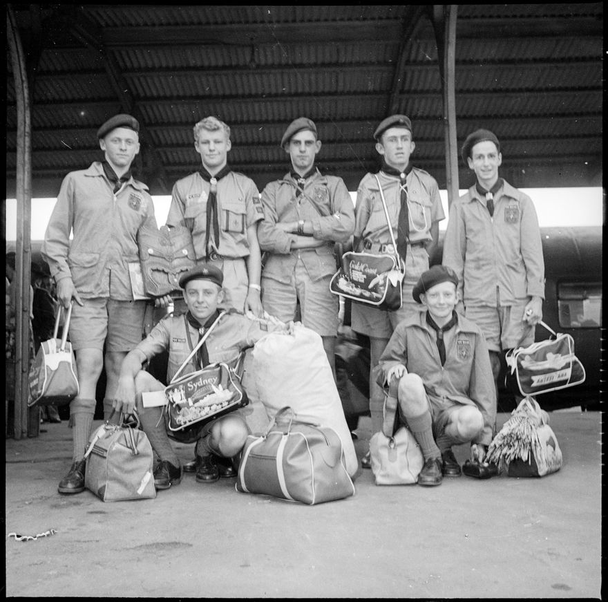 This image was taken for a story that ran in The Manawatu Evening Standard on 01 February 1961: "Scouts from the Palmerston North area who have been attending the Jamboree in Australia returned to the city this morning. This group was photographed at the railway station."