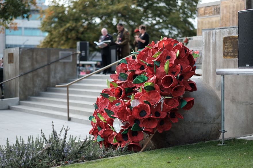 The Poppy Wreath at ANZAC Day Commemorations, 2018. Members of the Palmerston North community created the poppy installation, with Rangiwahia Environmental Art Trust.