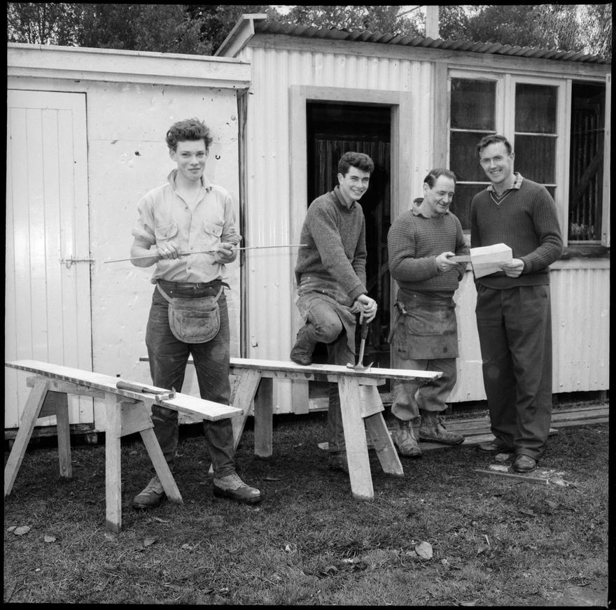This image was taken for a story that ran in the Manawatu Evening Standard on 16 July, 1963. "Workmen were erecting sheds at the Awapuni racecourse today preparatory to work starting on the new members' stand. Work will start on the £127,000 project on Monday next. from the left are Messrs. R. Hewson, D. Purdie, C. Wood and R. King."