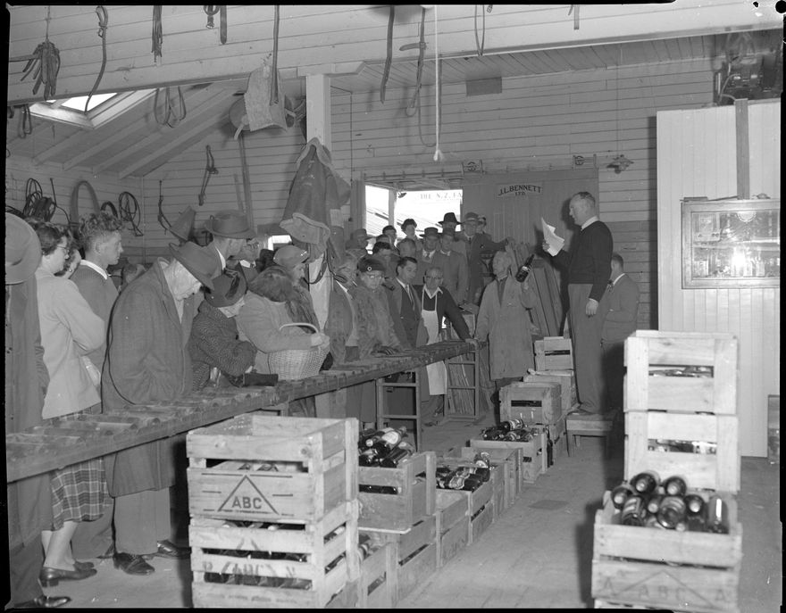 This image was taken for a story that ran in The Manawatu Evening Standard on 26 June, 1959. "A numer of lots of cased liquor were sold in Palmerston North by auction. The picture shows prospective buyers eyeing the liquor during the sale."