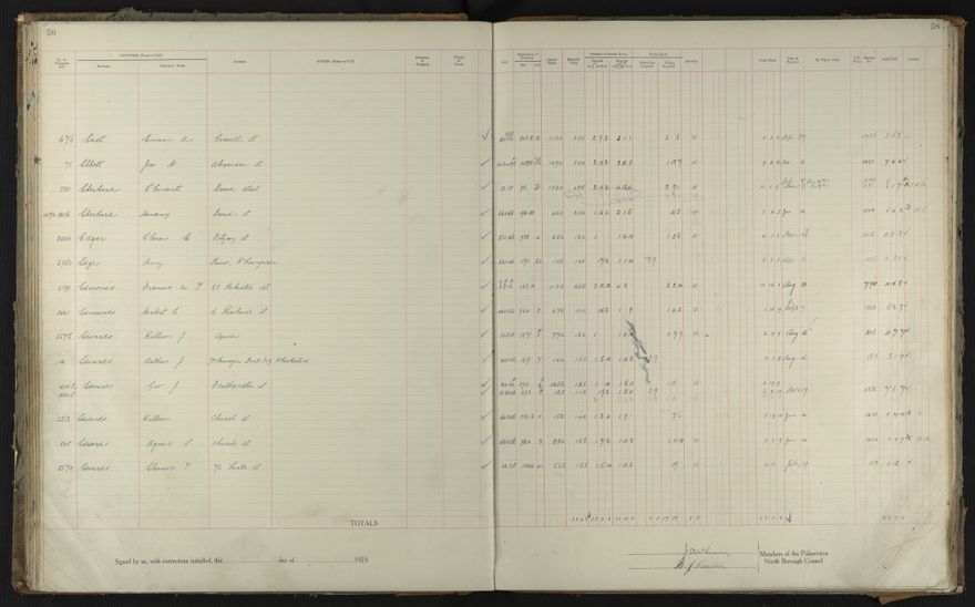 Palmerston North Borough Council rate book, listing rate payers for the years (1 April - 31 March) 1923 - 1924. Gives names, street, owner (if different to rate payer), legal description of property, capital and unimproved values and rates paid.