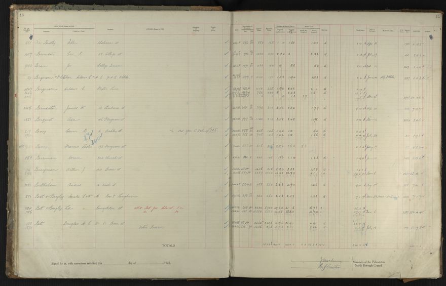 Palmerston North Borough Council rate book, listing rate payers for the years (1 April - 31 March) 1923 - 1924. Gives names, street, owner (if different to rate payer), legal description of property, capital and unimproved values and rates paid.