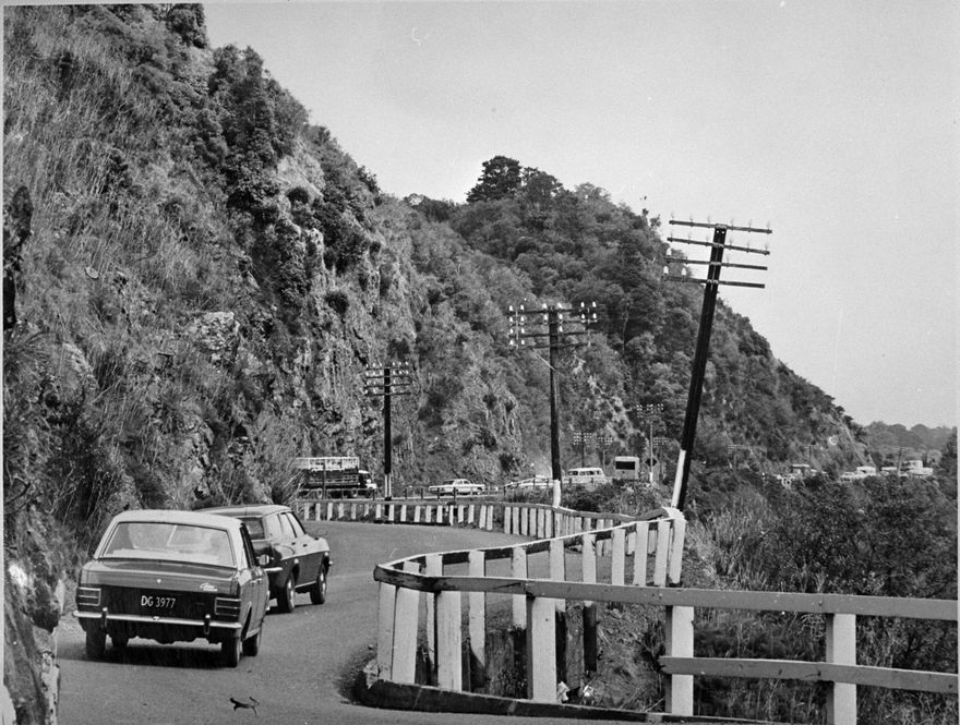 - The Manawatu Gorge road looking west. A line of traffic waits for west-bound vehicles to pass the temporarily controlled section of the highway. The two bluffs shown here were removed to provide 50,000 yards of earthwork material for the Ballance Bridge built across the Manawatu River in 1971.