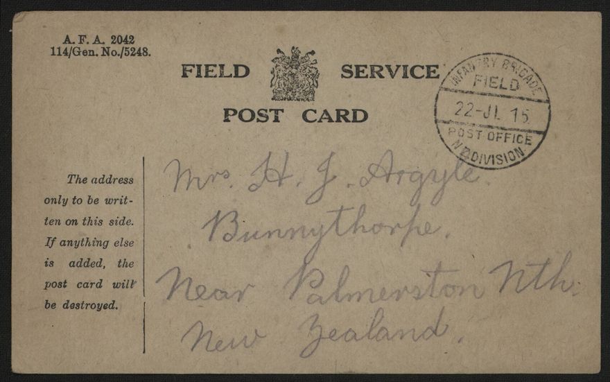 Postcard sent to Hector Argyle of Bunnythorpe, from his brother Len who was serving overseas in World War One. Nothing personal was written on these postcards, except for a name and date.