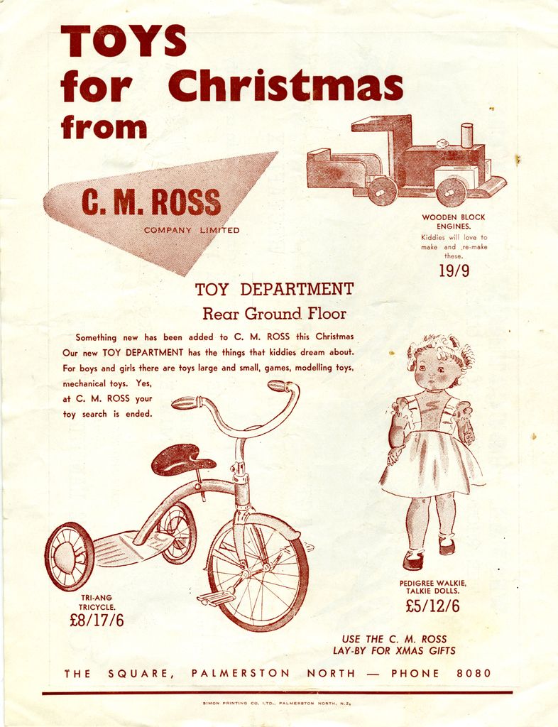 C M Ross Co. Ltd was one of the foremost department stores of Palmerston North and operated in The Square from 1883 until it was sold to Milne and Choyce in 1959. Advertisement on the back cover of the Manawatu Repertory Society's production of 'Toad of Toad Hall' programme, produced in association with the Palmerston North Jaycees at the Opera House.