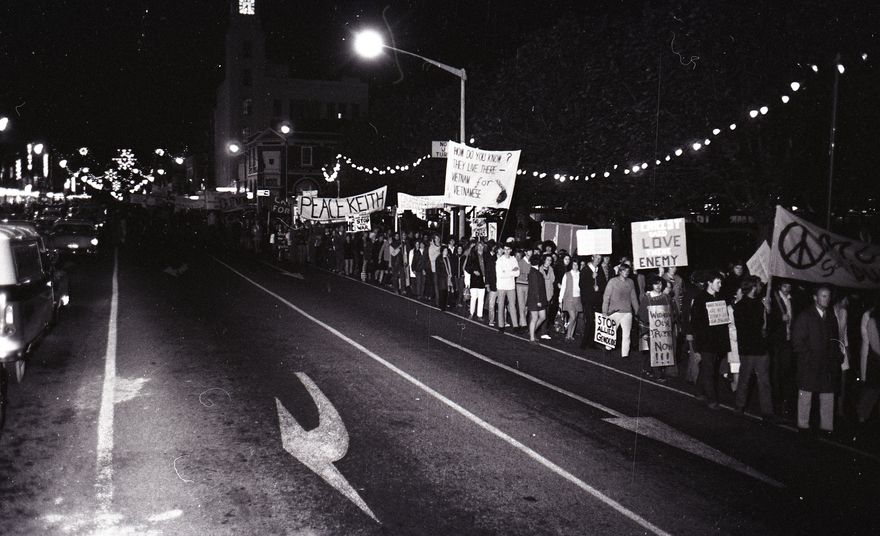 This image was taken (but not used) for a story that ran in The Manawatu Evening Standard on the 1st of May 1970. "Two thousand people sat and stood in front of the Palmerston North Clock Tower last night and sang “We Shall Live in Peace” as the climax to probably the biggest protest march held in Palmerston North.”