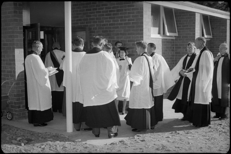 Caption: “Clergy from the surrounding districts seen entering the recently completed church at Oroua Downs.”