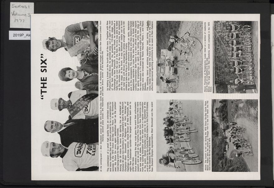 A photograph album from Alexander Clark LTD, a Palmerston North-based home and commercial decoration business. The content is focused on a cycling race - possibly the 1977 Tour of the North Island - when Dulux Paints were the major sponsor.