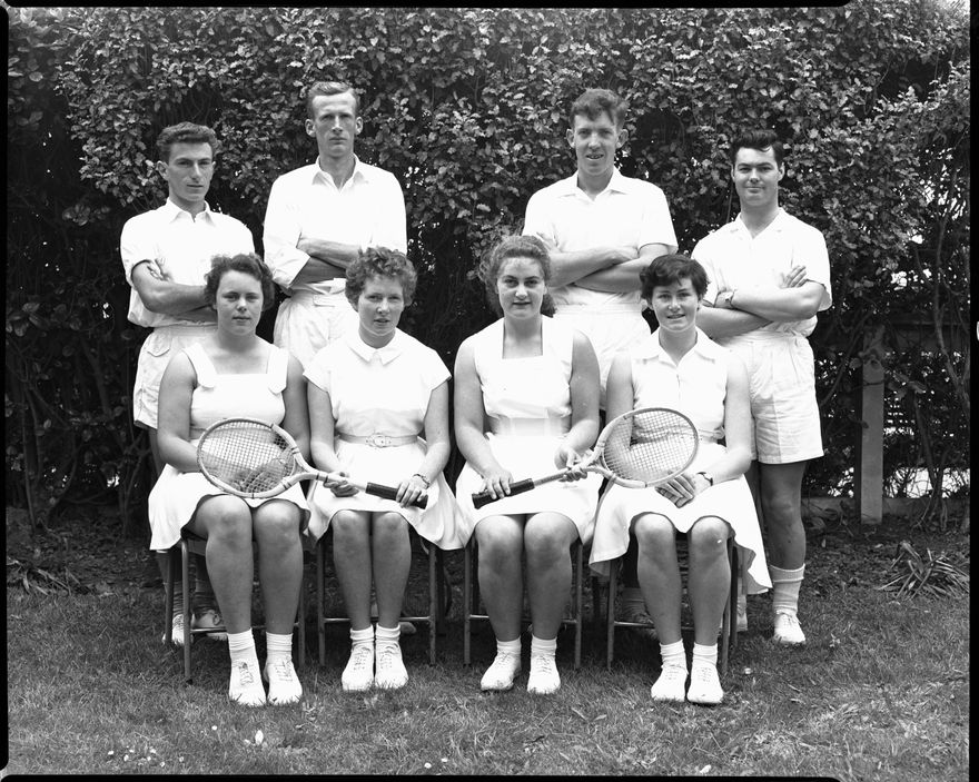 A group of eight students from the Palmerston North Teachers' College pose with tennis rackets. This negative comes from the Elmar Collection - a large series of semi-identified and unidentified images from the 1930s-1970s.