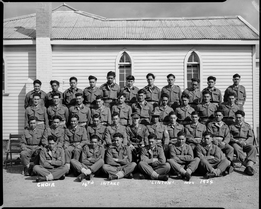 A group of 38 members of the army choir, most of them Māori, pose outside a church building at the Linton Army Camp. This negative comes from the Elmar Collection - a large series of semi-identified and unidentified images from the 1930s-1970s.