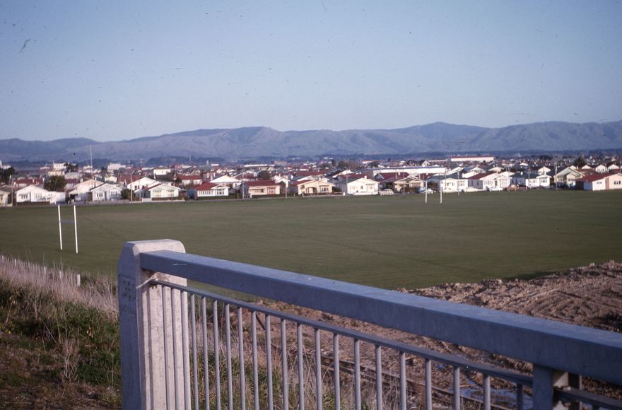 A view of the city as you cross the Rangitikei Overbridge, looking across Coronation Park to the houses and hills beyond.