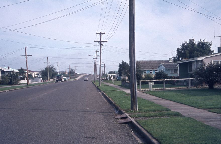 View down Highbury Ave, looking towards the intersection with Coventry Street and the bridge over the Mangaone Stream. The house closest to the camera on the right is 74 Highbury Avenue.
