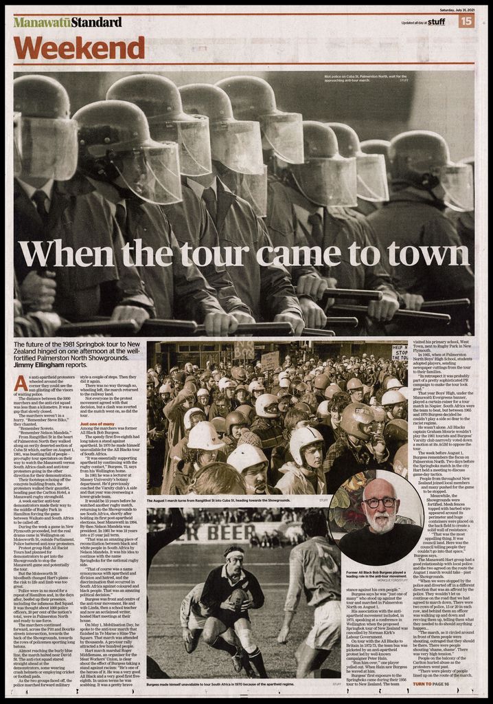 Manawatū Standard article about the 1981 Springboks tour and the role protesters played in the anti-our movement. The Springboks vs All Blacks game on 1 August 1981 in Palmerston North was marred by protest, conflict between rugby supporters, anti-tour protesters and the police. Thousands of people demonstrated, clashing with rugby supporters in several locations. National anti-tour protest groups Hart and Mast organised local protest marchers. The showgrounds were barricaded with large containers and fences topped with barbed wire to keep out opposition to the game.