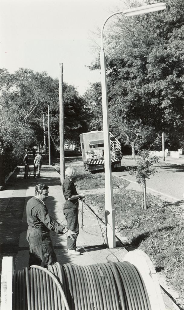 - Work men lay cables down tree lined Batt Street