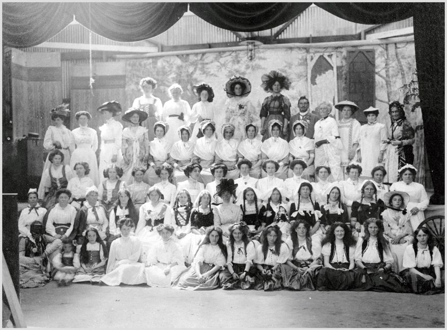 A group of costumed people pose for a photograph on the stage of an unidentified hall. James Alfred Nash, future mayor of Palmerston North, is visible in the back row. His wife, Elizabeth Nash, is in the middle of the second row from the front wearing the large dark hat. The Palmerston North Hospital was opened in 1893, made possible by agitation for a local hospital and extensive community fund raising. Prior to this the Palmerston North Borough Council sent patients to Whanganui.