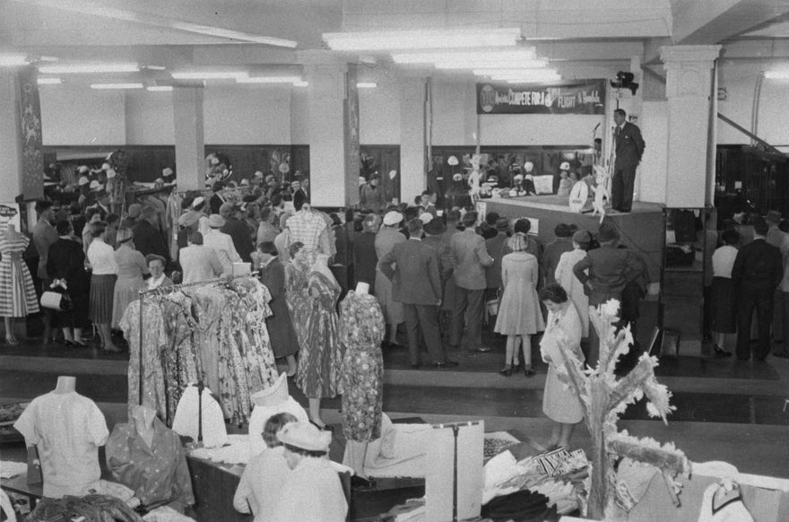A crowd watches a Y F C competition, held in the C M Ross Department store. Part of the competition was sheep shearing, and the winner won a trip to Honolulu by Pan Pacific Airways.