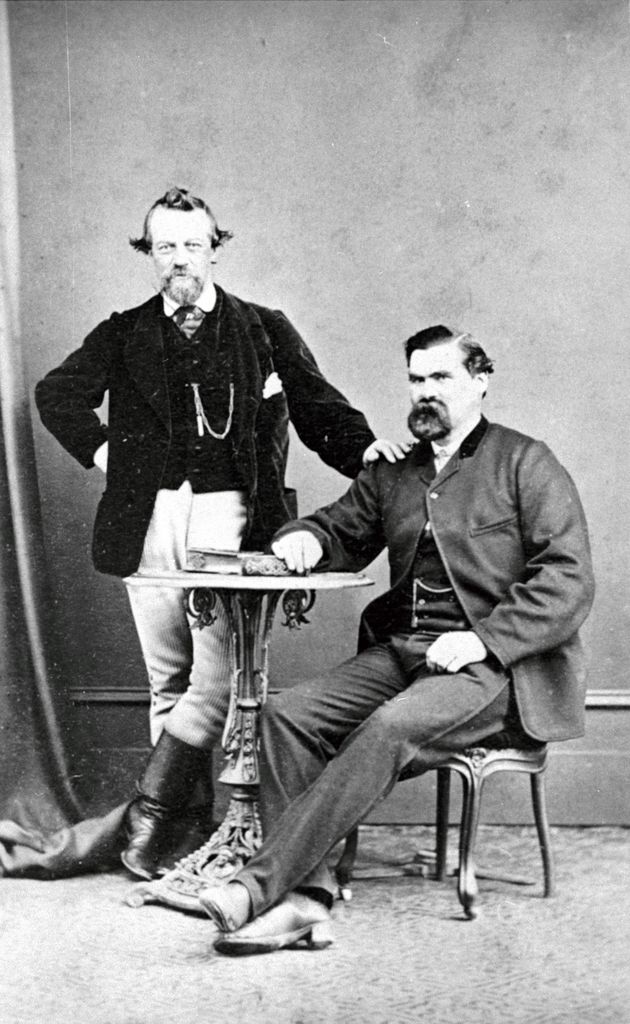 Andrew Young, on the right, was born in England and emigrated to Australia in 1855. He established himself in the coach business there, and later in New Zealand (in Otago 1862 – 1868 and in Westland 1868 – 1871). In partnership with Shepard, Young gained the franchise on the Wellington – New Plymouth mail run. Shepard drowned within a few months, but Young continued the business until 1882. In the 1890s he again operated in the South Island. In 1894 he narrowly lost Wellington’s mayoralty.