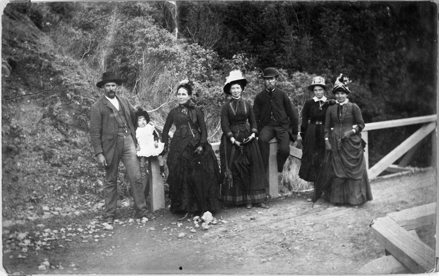 Taken after the main part of the Manawatu Gorge road was completed in May 1875. The only identified person is William Jones, seated on the bridge railings.