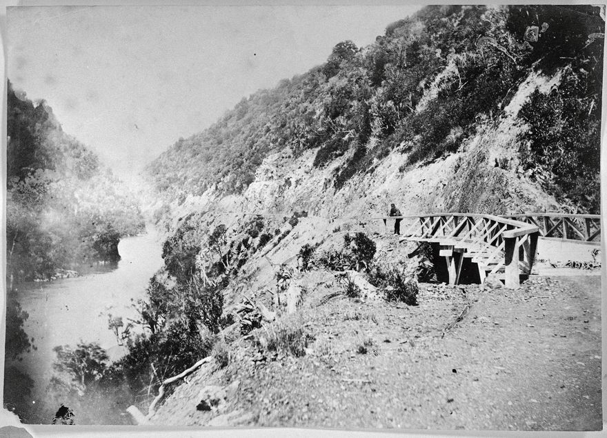 A road through the Gorge, linking Manawatu with Wairarapa and Hawkes Bay, was constructed 1871-1872. This photograph, taken, from the east, was taken before the construction of the railway on the opposite bank in 1891.