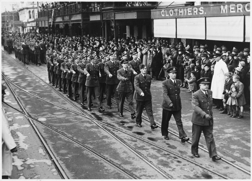 Parade of RNZAF personnel during World War Two, probably in Christchurch, led by Philip Fowler, Commandant of the Air Training Corp for New Zealand..