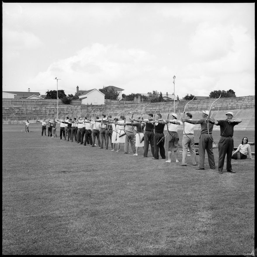 This image was taken for a story that ran in The Manawatu Evening Standard on 20 January, 1964. "Archers competing in the Wellington provincial archery championships draw their bows to the ready position in the teams competition on Saturday, at Memorial Park. With fine weather, some fine scores were recorded."