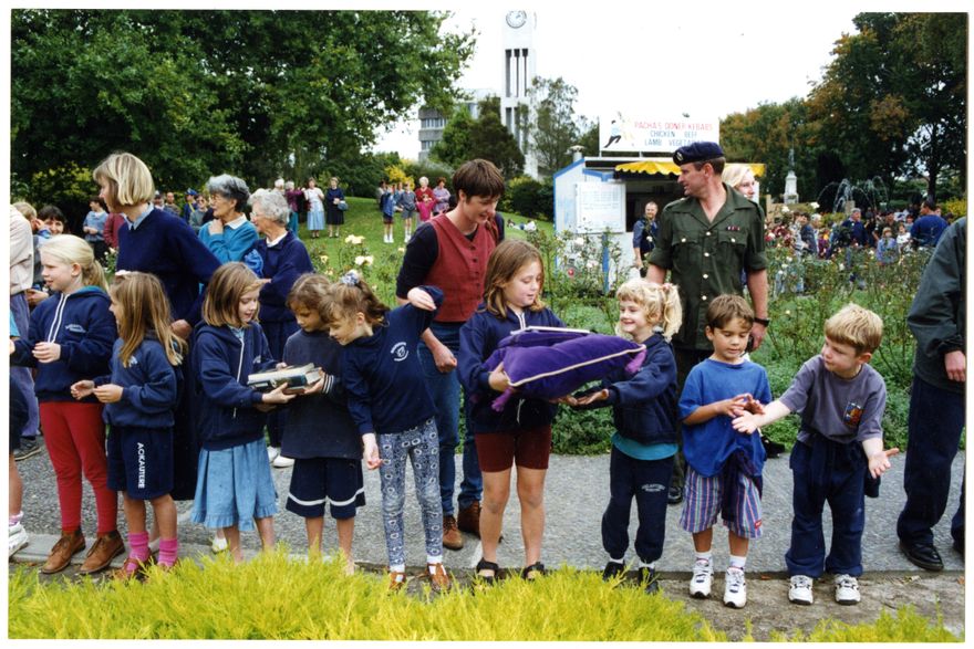 When the Palmerston North City Library moved from the corner of Main Street East and The Square to its present location in the old CM Ross Building, a book chain was undertaken to commemorate the occasion. Here we see local children participating in this event. From left: Phoebe Roach, Holly Wenborne, Unknown, Trudy Rabone, April Schroder, Hazel Schoder (red vest, in back), Jennifer Kilsby, Remy Irvine, Oliver Pendergast, Amon Roach.